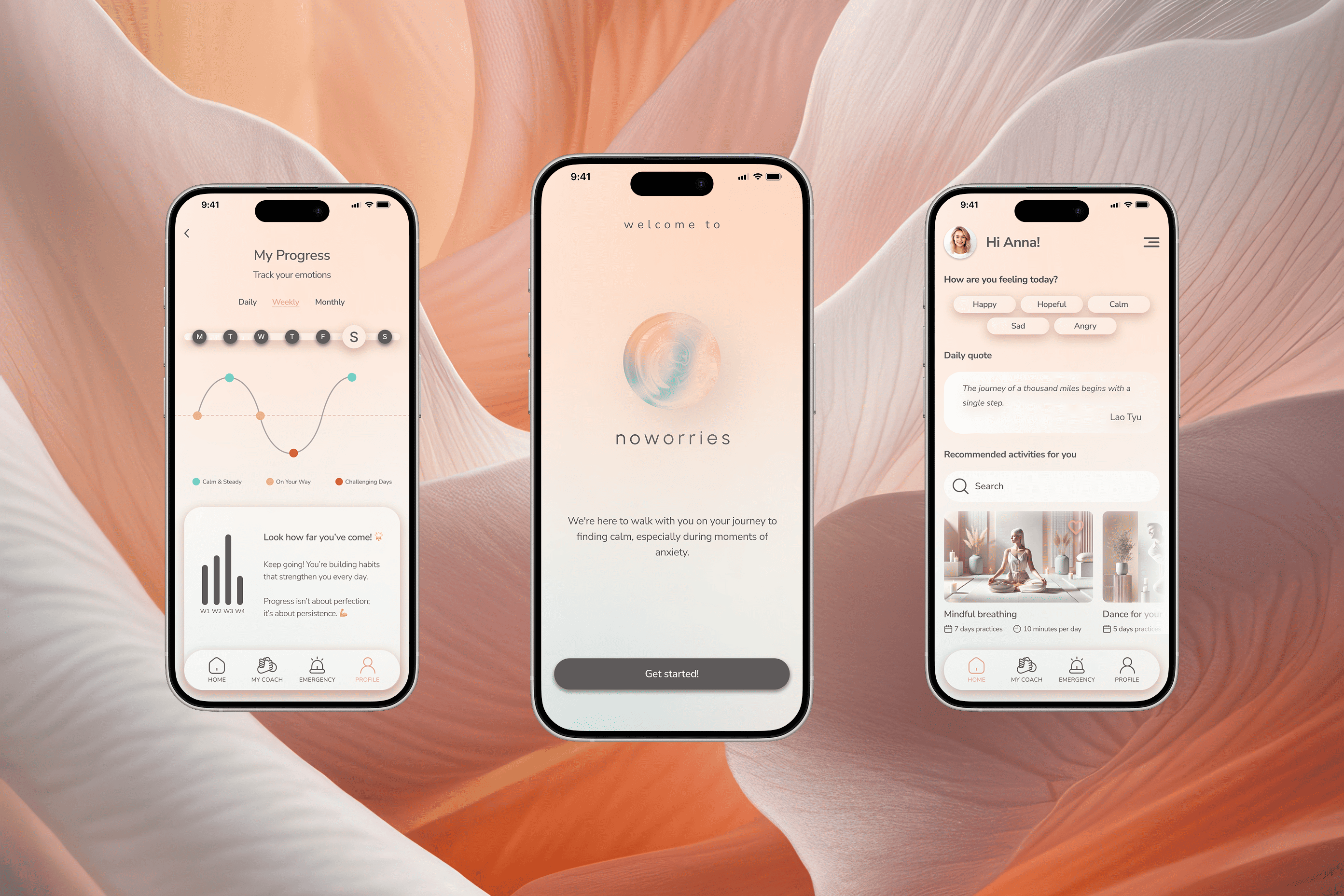 After defining the visual identity, user flows, and interactions, we created NoWorries—an adaptive anxiety management app that provides real-time emotional support, dynamically adjusting to each user's emotional state for immediate, relevant relief.